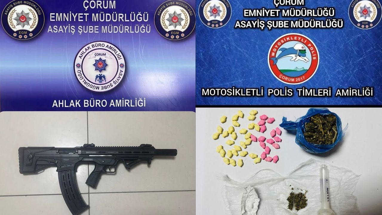 Çorum İl Emniyet Müdürlüğü’ne bağlı polis ekipleri tarafından yapılan şok uygulamalarda çok sayıda silah, uyuşturucu madde ile 8 aranan şahıs yakalandı.