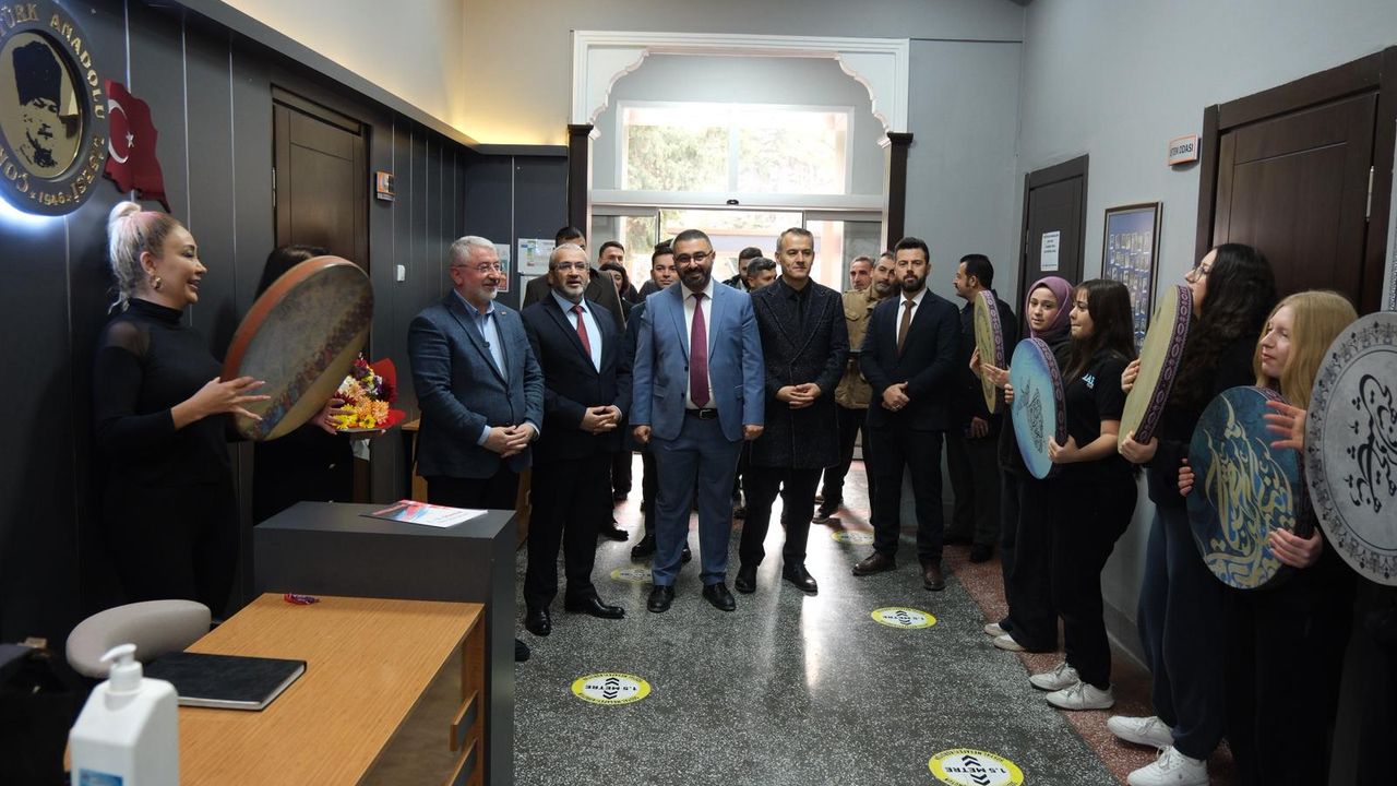 Okula girişte öğrenciler tarafından tef çalınarak karşılanan Başkan Aşgın ve Milli Eğitim Müdürü Cemil Çağlar, daha sonra okul konferans salonunda öğrencilerle bir araya geldi.