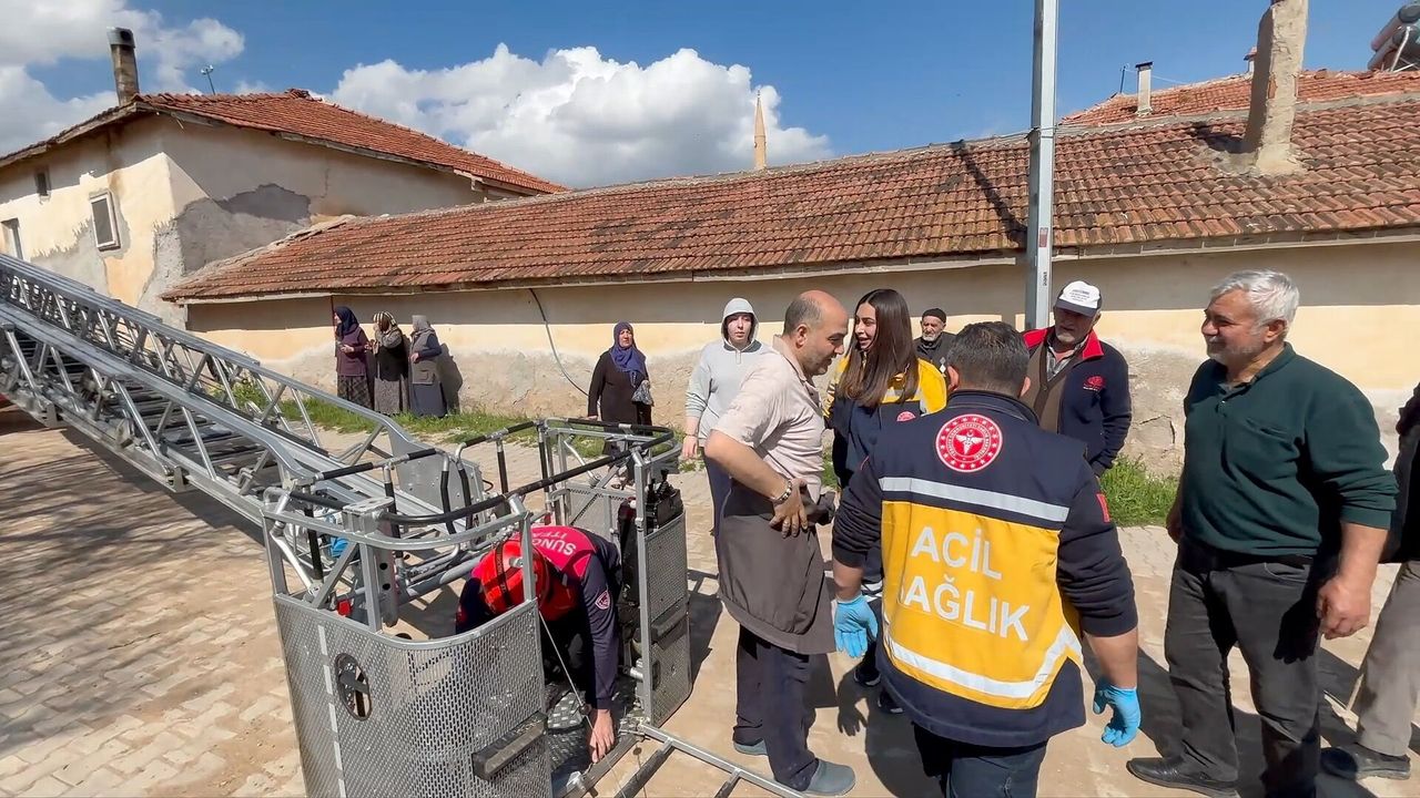 Sungurlu Belediyesi itfaiye ekipleri, itfaiye merdiveni kullanarak ulaştığı Tokgöz'ü güvenli şekilde indirerek, sağlık ekiplerine teslim etti.