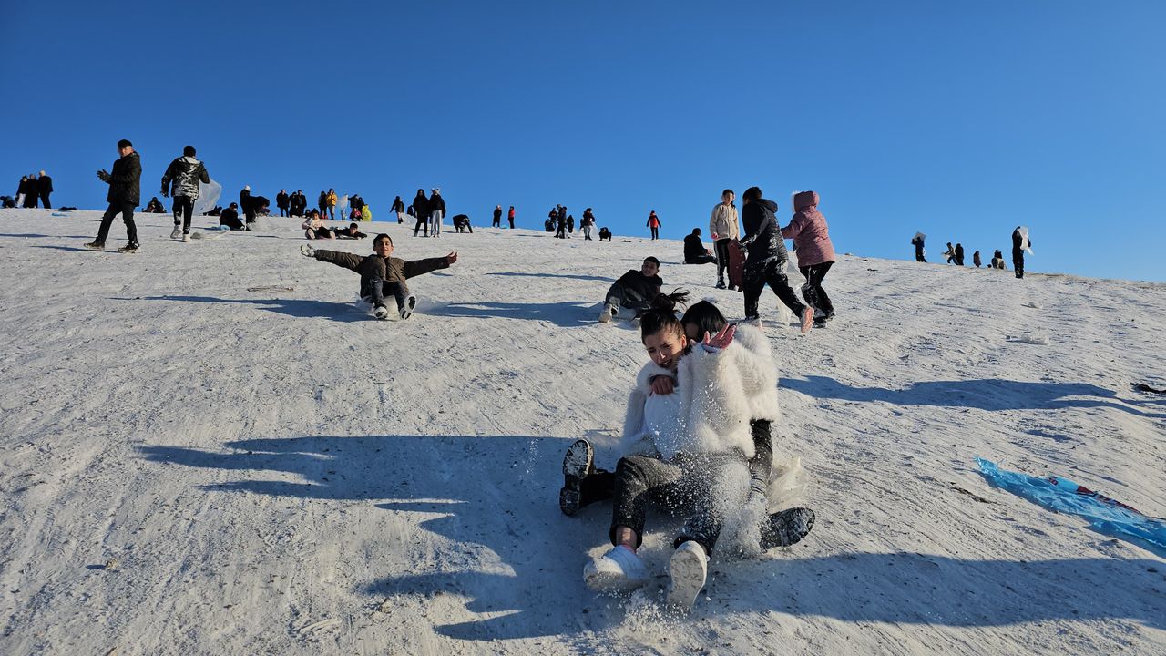 "Kar tatili"ni fırsat bilen çocuklar, Kale Mahallesi Ekin Caddesi'nde bulunan tepede yoğunluk oluşturdu.