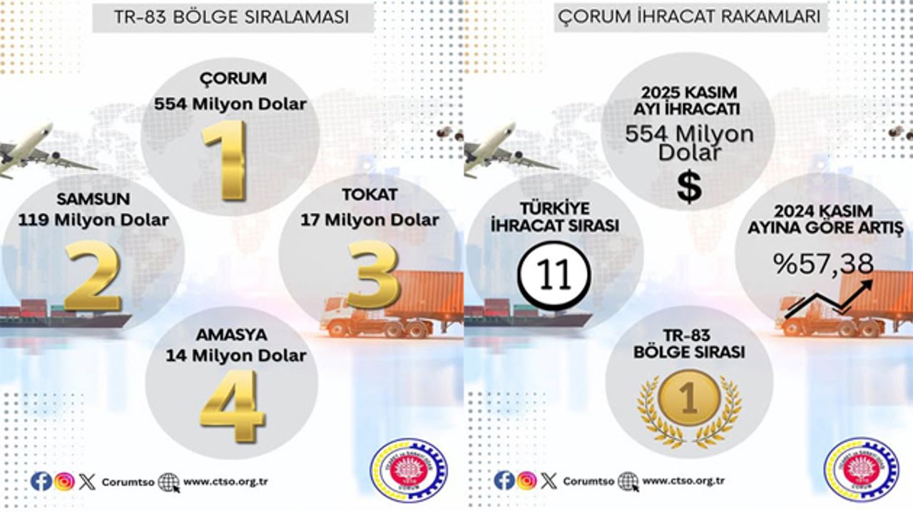 2024 Kasım ve 2025 Kasım ayları kıyaslandığında, 202 milyon dolarlık artış ile Çorum’un ihracatını en fazla artıran üçüncü il olduğuna dikkat çekilen açıklamada, Bu başarının, Çorum’un Kasım ayında TR-83 Bölgesi’nde en fazla ihracat yapan il olarak 1. sırada yer almasını sağladı ifade edildi.