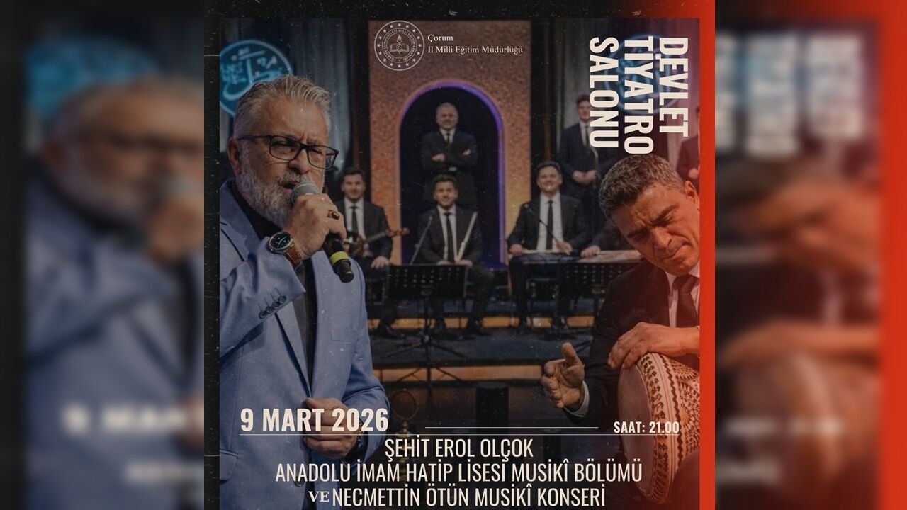 9 Mart 2026 Pazartesi günü saat 21.00’de Çorum Devlet Tiyatro Salonu’nda gerçekleştirilecek programda, Şehit Erol Olçok Anadolu İmam Hatip Lisesi Musiki Bölümü öğrencileri sahne alacak.