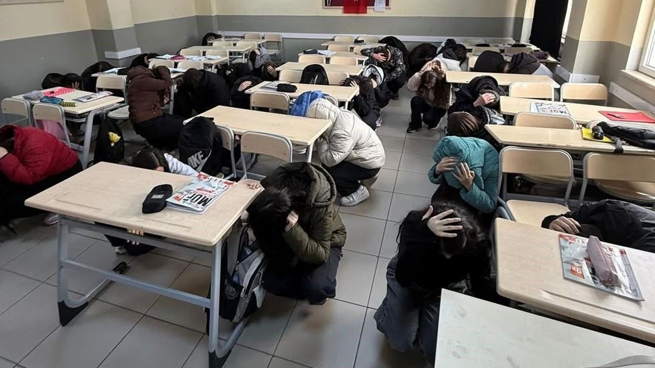 Tatbikat kapsamında deprem alarmının verilmesiyle birlikte öğrenciler sınıflarında “çök–kapan–tutun” hareketini uyguladı.