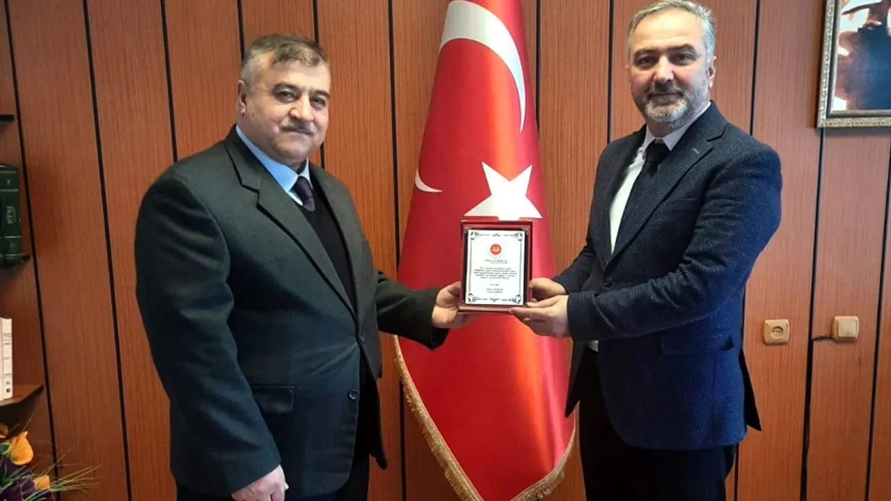 Çorum İl Müftüsü Şahin Yıldırım, emektar personelini makamında kabul ederken hayırlı olsun temennileriyle başarılı hizmetleri nedeniyle Arif Mercan’a plaket takdim etti.