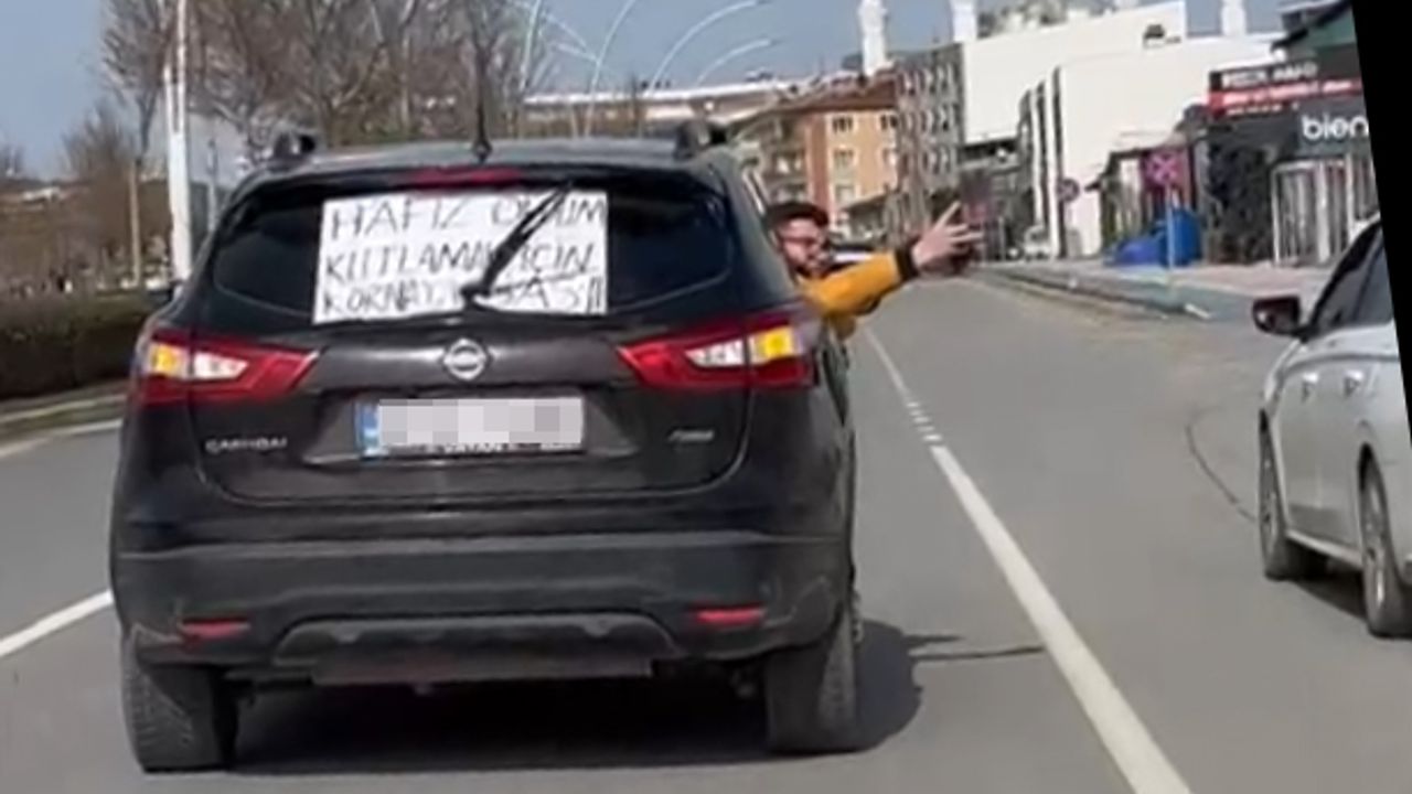 Otomobilinin arkasına astığı hafız oldum kutlamak için kornaya bas yazısı ile Çorum’da tur atan vatandaş, trafikte araç kullanan vatandaşlar tarafından da ilgiyle izlendi.
