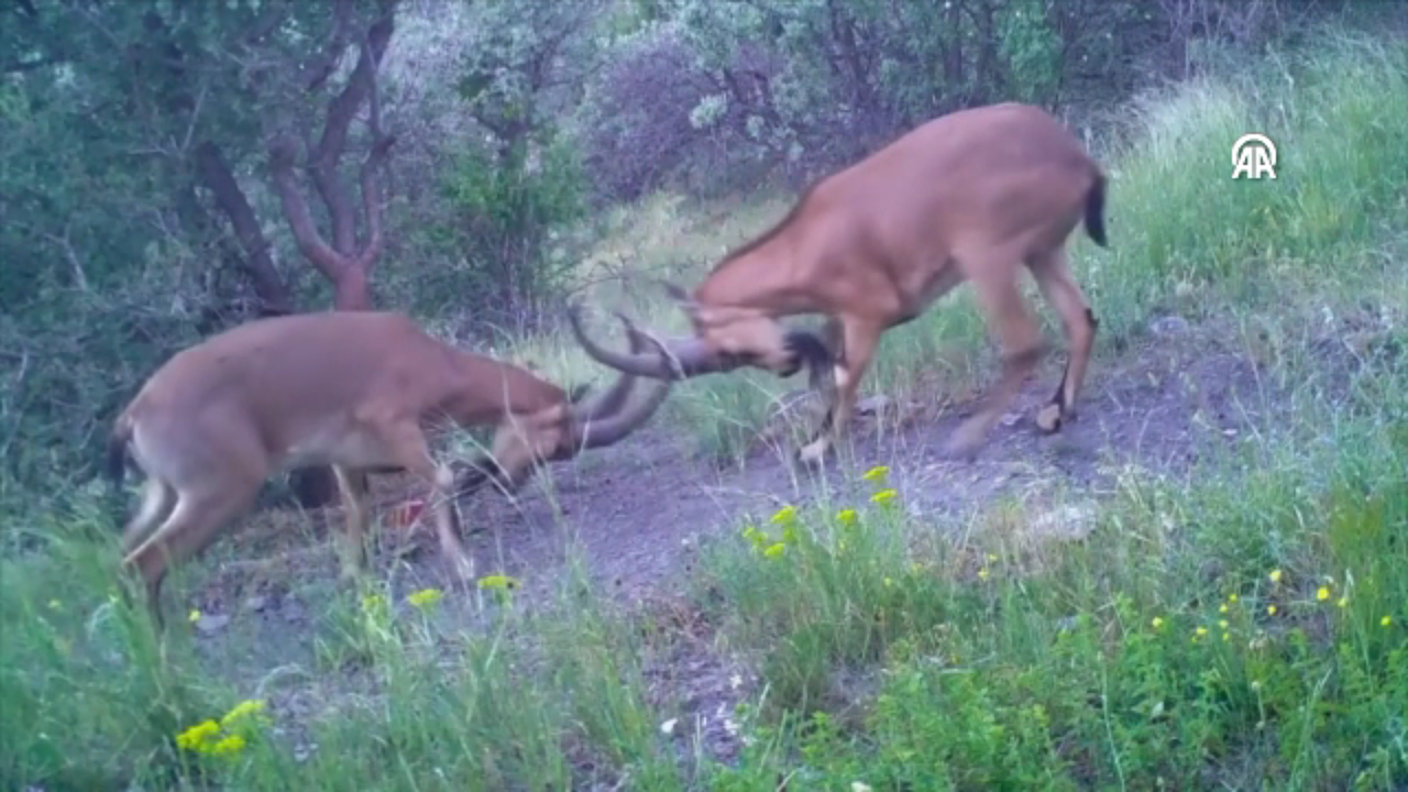 Çorum'un Kargı ilçesinde dağ keçilerinin kavgası fotokapanla görüntülendi.