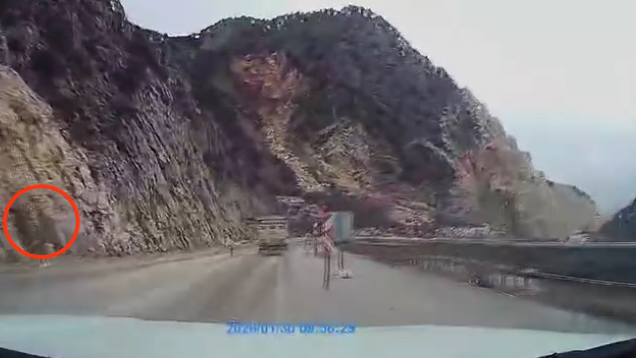 Çorum Osmancık karayolu Kırdilim mevkiinde seyir halindeyken yağışlarında etkisiyle yola düşen dev kaya kütlesinin çaptığı araçta bulunan kamera olay anını saniye saniye kaydetti.