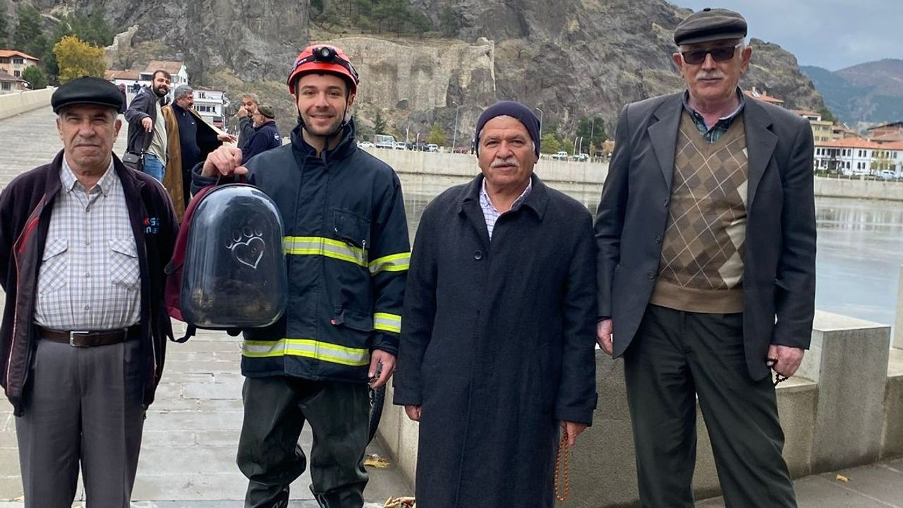 Çorum'un Osmancık ilçesinde nehre düşen kedi, itfaiye ekiplerince kurtarıldı.