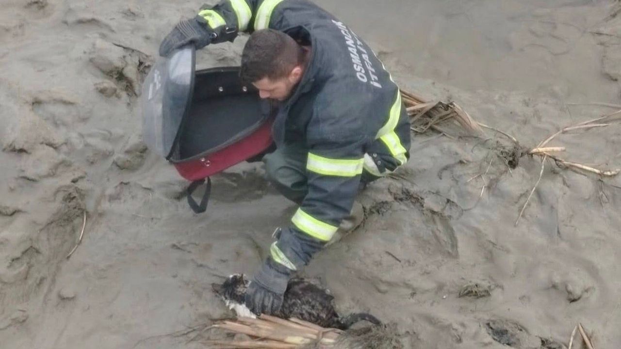 Osmancık’ta Kızılırmak’ta balçık içinde yardım isteyen kediyi gören vatandaşlar, durumu 112 Acil Çağrı Merkezi’ne bildirdi.