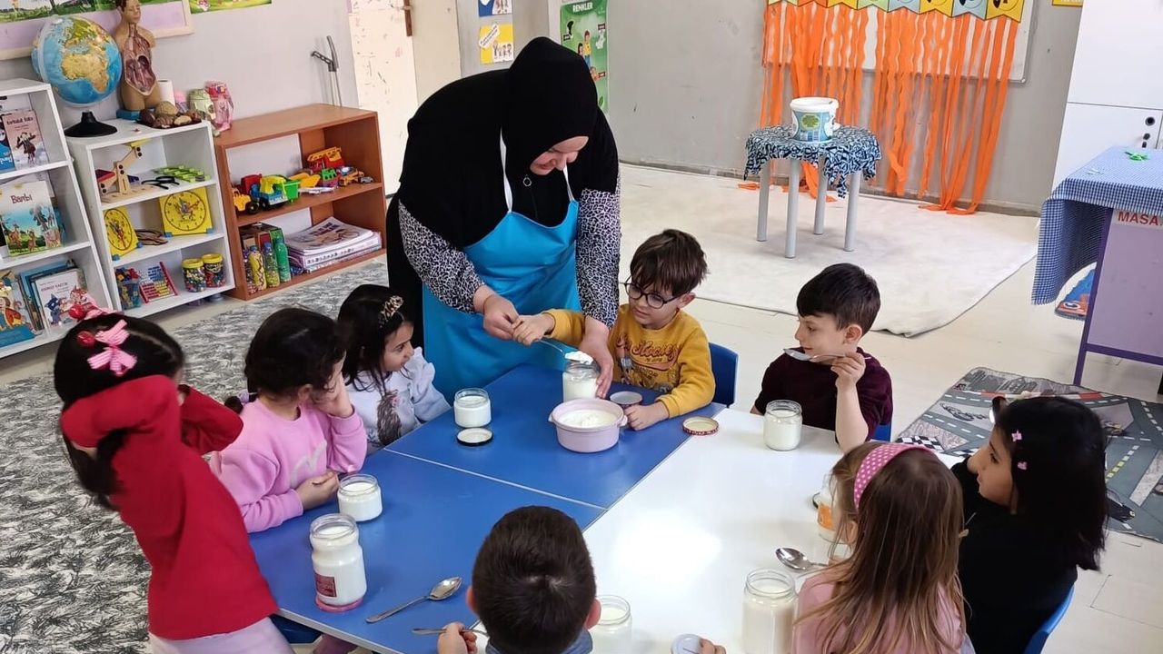 Çorum'un Kargı ilçesinde ana sınıfı öğrencileri, ramazan ayı etkinlikleri kapsamında mutfak atölyesinde yoğurt mayaladı.