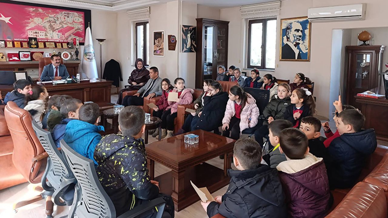 Hazırladıkları soruları Belediye Başkanı Veli Aylar'a sorarak merakla cevapları dinleyen öğrenciler, aynı zamanda emekli öğretmen olan Belediye Başkanı Veli Aylar’ın öğretmenlik yıllarına dönmesine neden oldu.