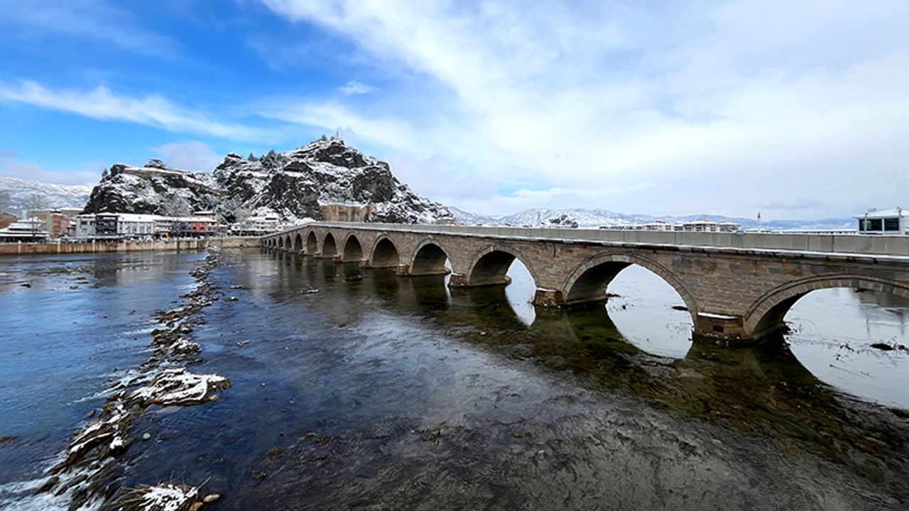 İlçe genelinde etkisini gösteren yağışın ardından Kandiber Kalesi, tarihi Koyunbaba Köprüsü ve Koyunbaba Türbesi karla kaplandı.