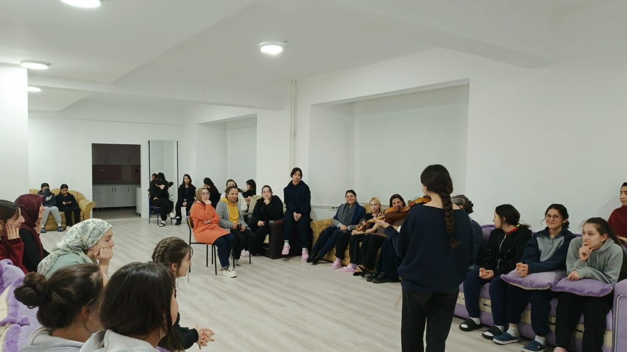 İftar sonrası öğrencilerin keman dinletisini ilgiyle dinleyen misafirler, pansiyon bünyesindeki dikiş kursunu da ziyaret ederek öğrencilerin diktiği kıyafetleri inceledi.