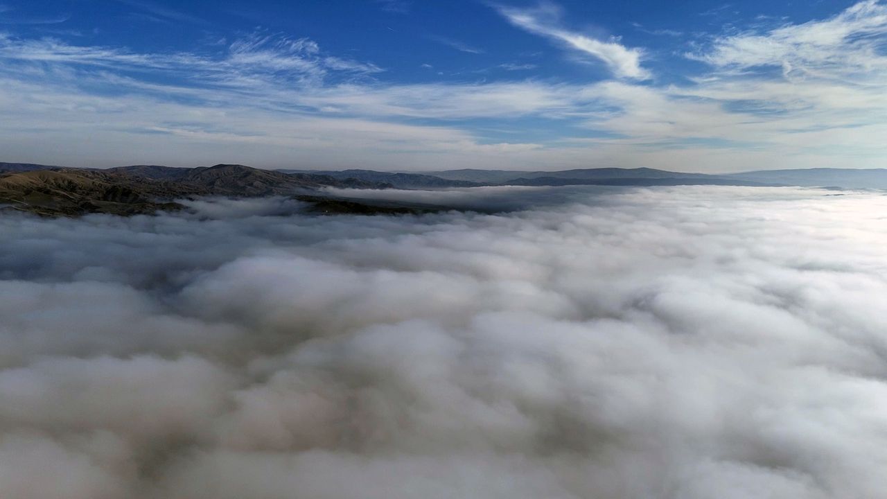 İlçe merkezinin üzerinin sis tabakasıyla kaplandığı görüntü, dronla kaydedildi.